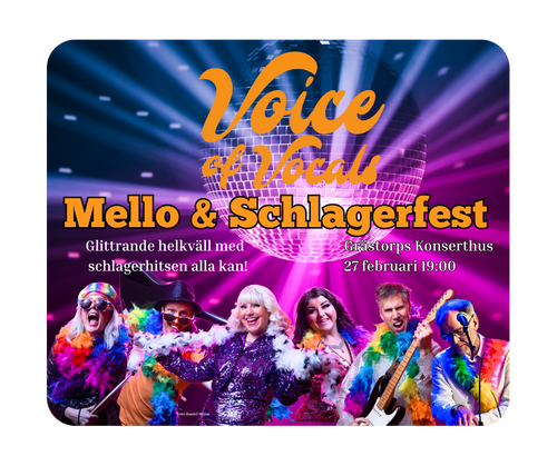 Möt Voice of Vocals från scenen- ett nöjeskoncept med långt artisteri inom showunderhållning och musikalproduktioner. Och med en stark tonsäkerhet och stor proffsighet kommer vi att leverera ett pärlband med klassiska mellolåtar genom tiderna i 2 set till er gäster! Kvällen avslutas med ett coverset med en mix av låtar som ALLA kan hänga på! Så på med dansskorna och sväng loss!